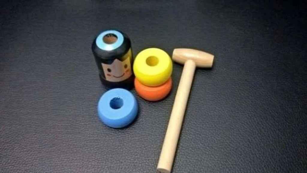 The magical Daruma jumps to avoid hammer. Even it is knocked down and collapsed, it magically re-shapes (re-builds).