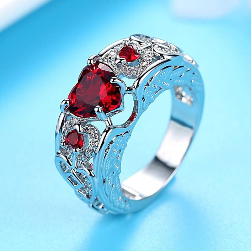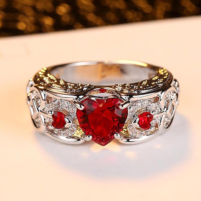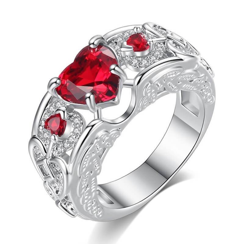 This July Birthstone ring is made of heart-shaped Ruby stone. The main stone is supported with four prongs to keep it secure. Along the side of the band of the ring are two smaller ruby stones.